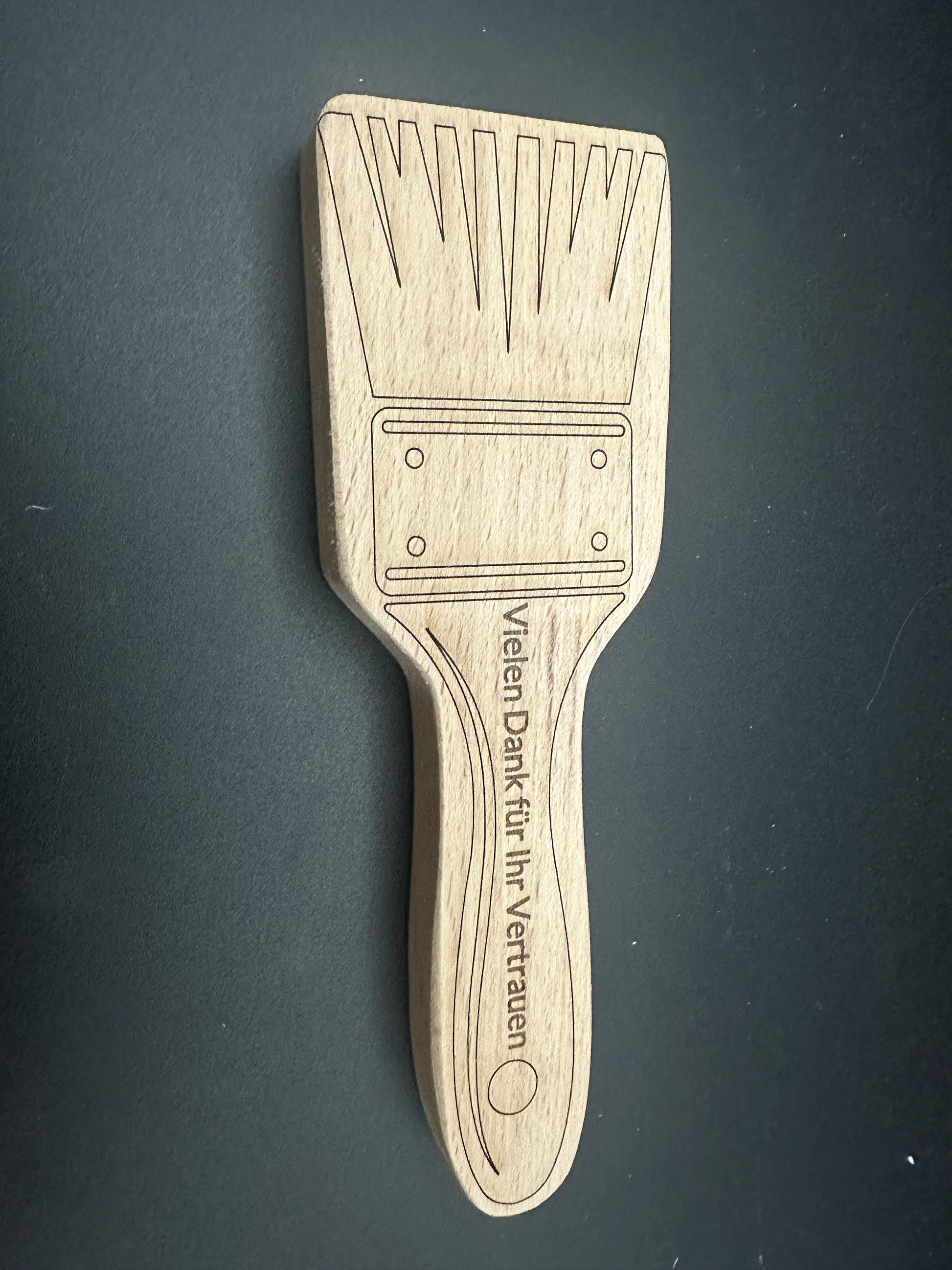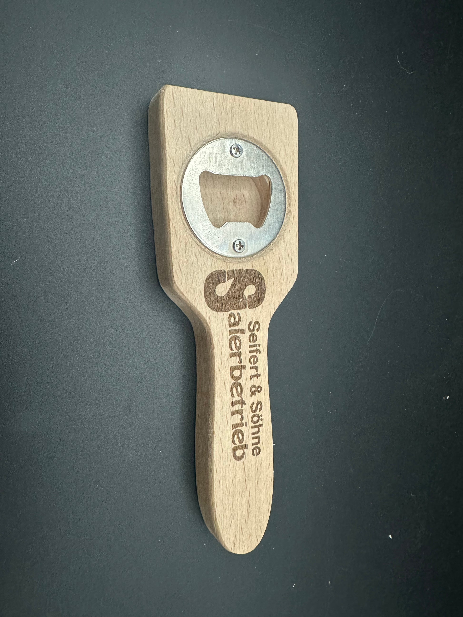 Dieser hochwertige Flaschenöffner aus massiver Buche vereint traditionelles Handwerk mit praktischem Nutzen. Die einzigartige Pinsel-Form macht ihn zum idealen Geschenk für Malerbetriebe, Handwerker oder als originelles Werbegeschenk für Ihre Firma.
