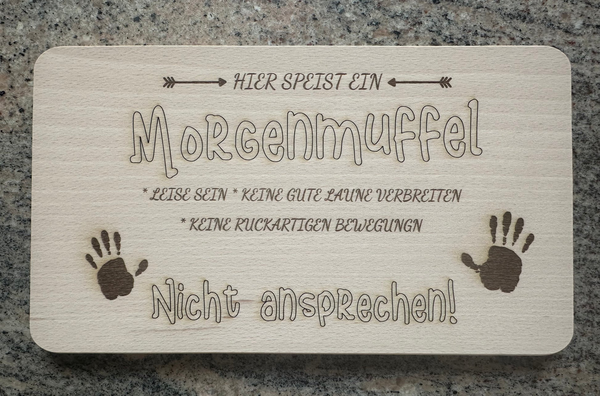- Humorvolle Gravur: Der Spruch "Hier speist ein Morgenmuffel" sorgt für gute Laune am Frühstückstisch