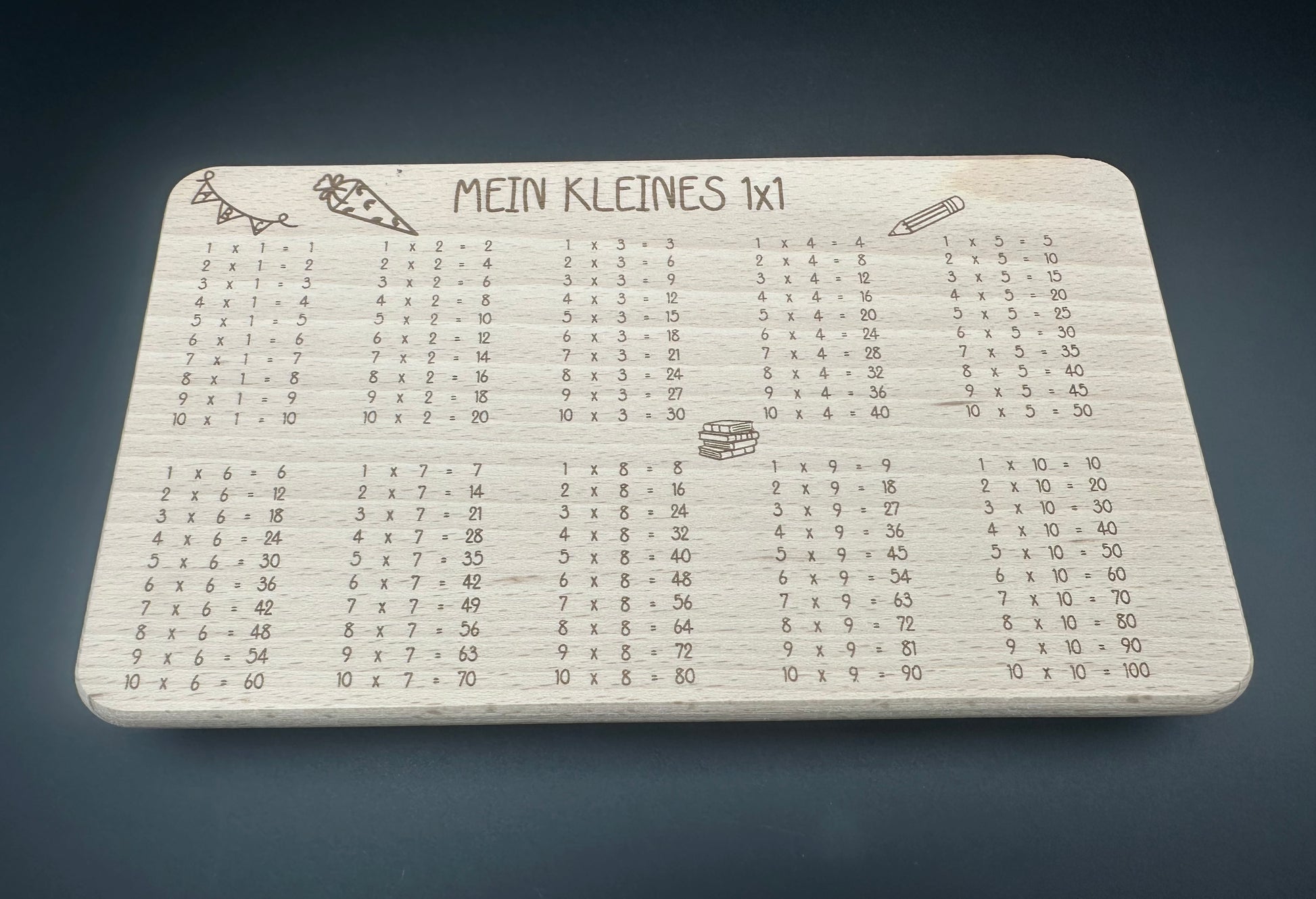 Verwandeln Sie jede Pause in eine kleine Mathe-Stunde! Unser liebevoll gestaltetes Vesper Brettchen „Mein kleines 1X1" aus massivem Buchenholz macht das Einmaleins zum täglichen Begleiter und jedes Pausenbrot zu einer Lernchance.